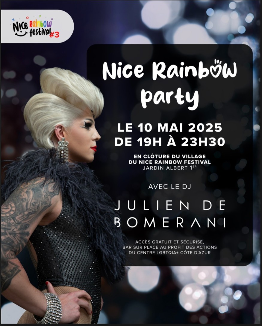???? En clôture du Village du Nice Rainbow Festival, le DJ, drag queen et producteur Julien de Bomerani mettra le feu au Jardin Albert 1er pour une fin de soirée libre et festive !