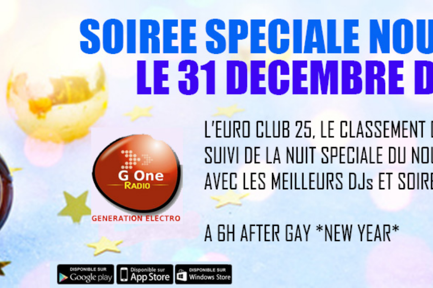 Le 31 décembre, G One s'occupe de cette soirée unique, réunissant les meilleurs Dj's et soirées de l'année.A partir de 18h : c’est l'Euro Club 25, les meilleurs titres qui vont ont fais danser en 2016Dès 20h : Coup d’envoi de la nuit mixée spéciale Nouvel An avec aux platines jusqu’à 6h du mat, les meilleurs DJ's et soiréeMORLANDO / 22h LAURENT SCHARK / 23h JOACHIM GARRAUD / 0h BENJI DE LA HOUSE / 1h LA DEMENCE…