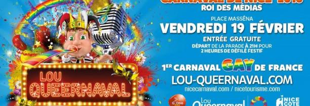 Organisé par l'Office du Tourisme et des Congrès, le carnaval de Nice se déroulera à Nice du 12 au 28 février.L'équipe du COC - Comité d'organisation de Lou Queernaval, est heureuse de vous inviter à réserver votre soirée du 19 février prochain, pour vivre la deuxième édition du premier carnaval gay de France, en partenariat avec G One, qui a attiré près de 15 000 spectateurs !