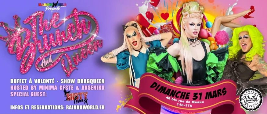 Le Brunch and Queen , le brunch le plus tucké de la capitale vous donne rendez-vous tous les dimanches au Wanted ! hosté par la sublime Minima Geste et la gorgeous Arsenika vous y retrouverez les Queens les plus démentes de la capitale et d'ailleurs tel que : Lolita Banana, Ginger Bitch, Misty Phoenix, MOON, Ruby Onthenail, Kitty Space..... qui se relaieront pour vous faire vivre un moment unique autour de notre buffet Italien XXL et à volonté comprenant un large choix de plats et desserts qui sauront vous séduire "vege friendly" ainsi qu'un buffet de boissons chaude et froide également à volonté.